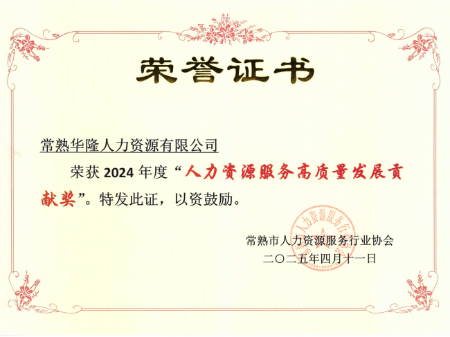 常熟华隆人力资源有限公司凭借其卓越的表现,荣获多项荣誉,成为行业内的佼佼者。公司荣获了2024年度“人力资源服务高质量发展贡献奖”以及2023年度“常熟市人力资源服务诚信机构”称号。