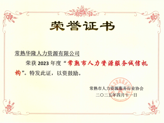 这些荣誉不仅是对华隆人力过往努力的肯定和对公司规范管理与诚信经营的高度认可,更是对其在行业内树立良好形象的有力证明和对其未来发展的重要激励。作为常熟市人力资源服务行业的诚信机构,华隆人力将继续坚守高质量发展与诚信经营的理念,严格遵守法律法规,全力保障劳动者合法权益。华隆人力在遵守劳动法律法规、保障劳动者权益、维护劳动关系稳定等方面始终发挥重要作用,为营造良好的人力资源市场环境作出了积极贡献。